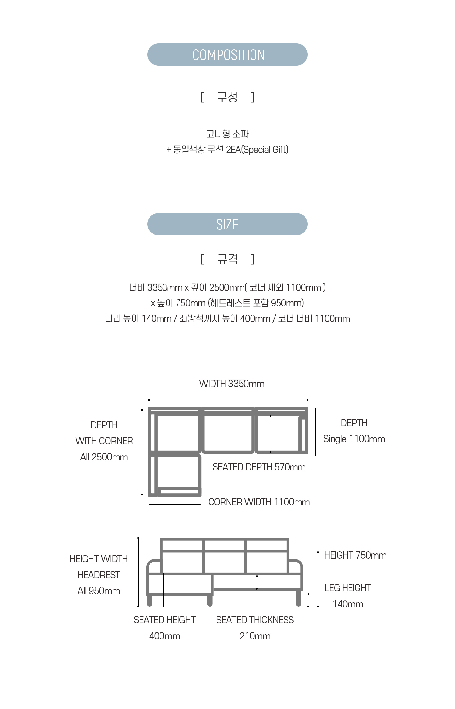 코너형 소파 + 동일색상 쿠션 3EA(Special Gift)
